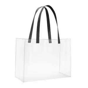 Transparent PVC shopping tote bag with black reinforced handles for waterproof carrying.