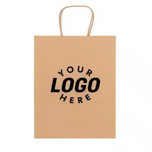 Brown kraft paper shopping bag with customizable printed logo, eco-friendly retail packaging.