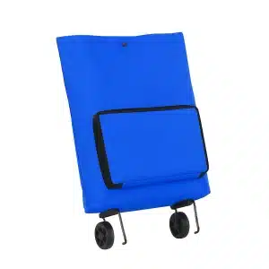 Blue foldable trolley shopping bag with wheels and front pocket for easy carrying.