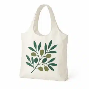 White reusable nylon shopping bag with green olive branch print, lightweight and foldable.
